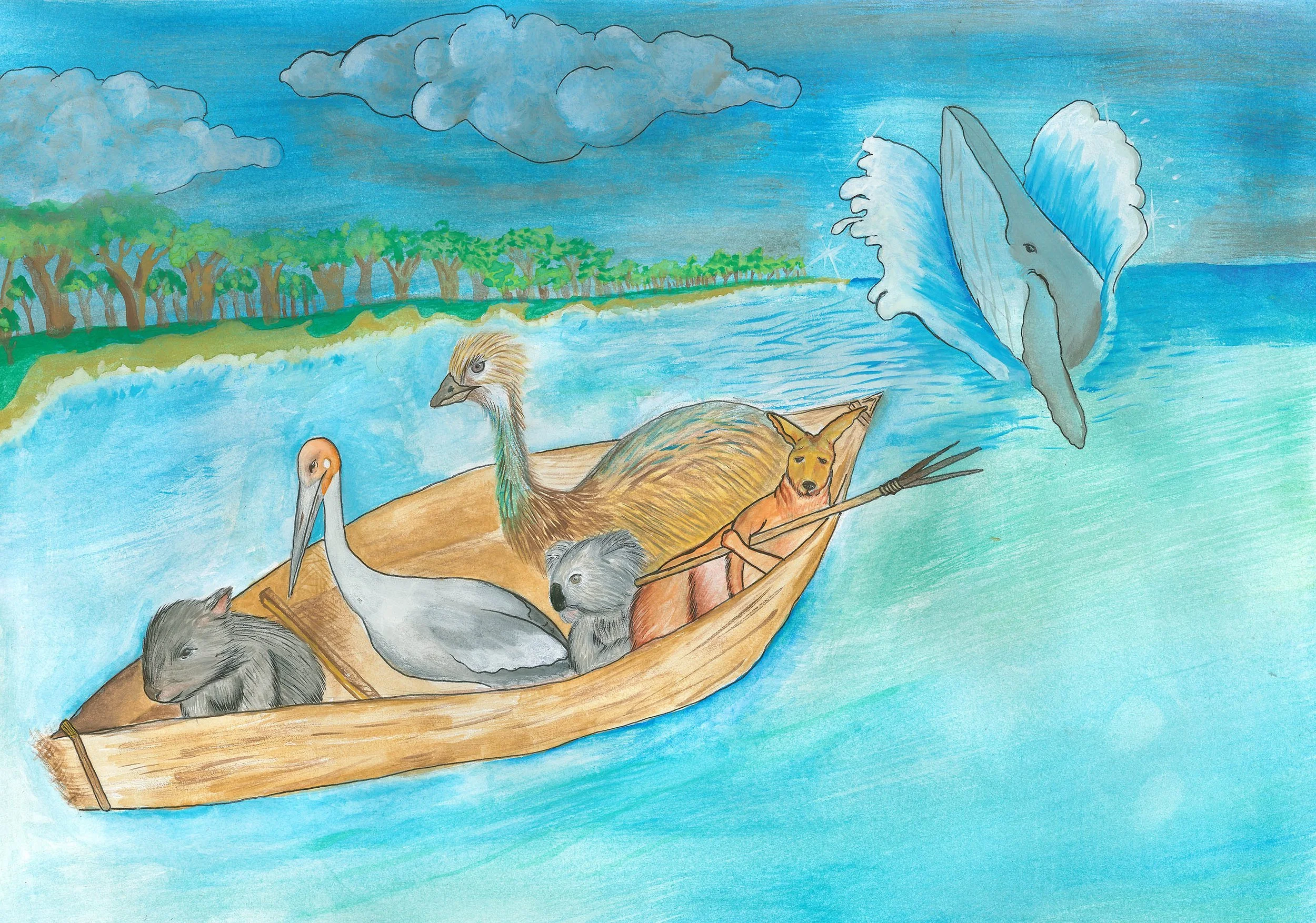 Eventually they saw new land and whale was close behind, and in his excitement the crane started to dance and grew feathers and a beak. As his long legs started to appear he put holes in the bottom of whale’s vessel, bringing water into it. As they reached land, and the people now animals hopped out of the vessel, koala pushed it out into the sea and it turned upside down and turned into a large island off Lake Illawarra called ‘gangmangang’.