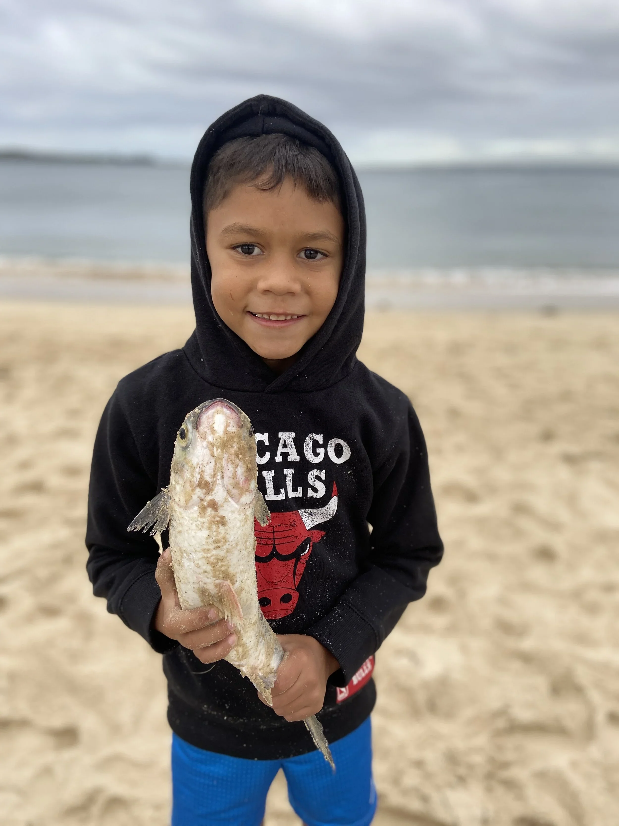 Leeton Ingrey, aged 7, holding a mara or mullet at Yarra Bay April 2020