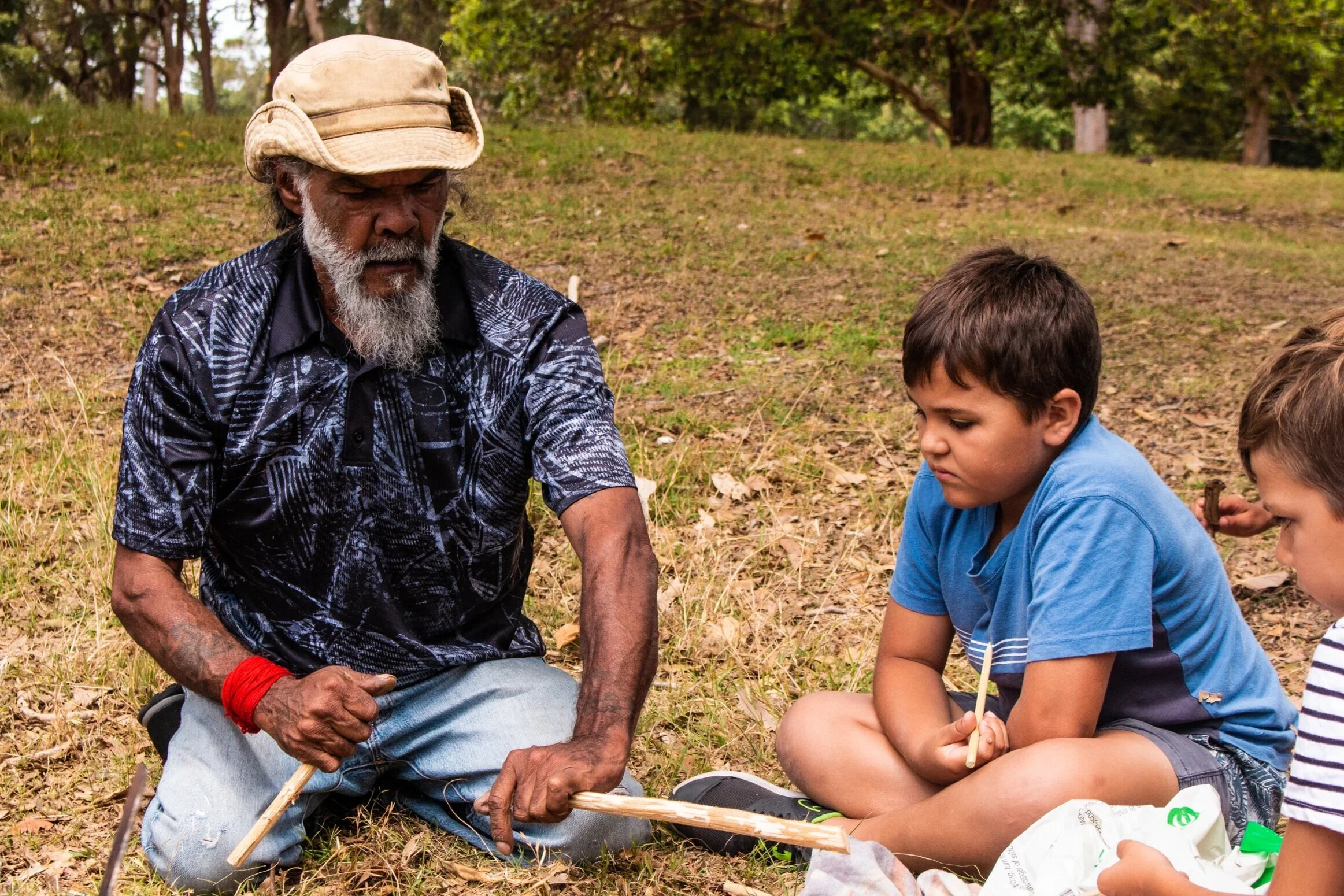 Uncle Rod Mason, Senior Leader of the Gweagal Clan teaching children how to make a garrara or fishing spear at Kurnell 2019