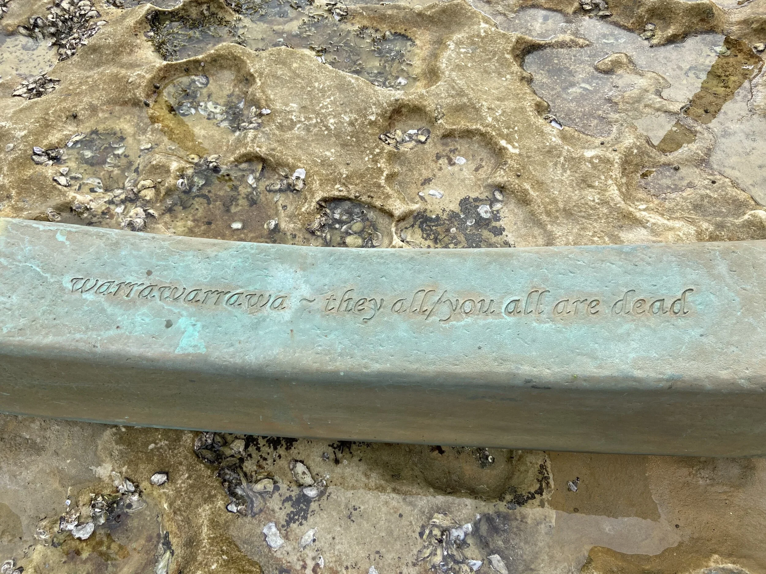 warrawarrawa - they all/you all are dead inscribed on the Commemorative Installation for the 250th Anniversary of the Endeavours’ arrival in Kamay (Botany Bay). Previous works installed promote the misunderstood interpretation of ‘go away’.